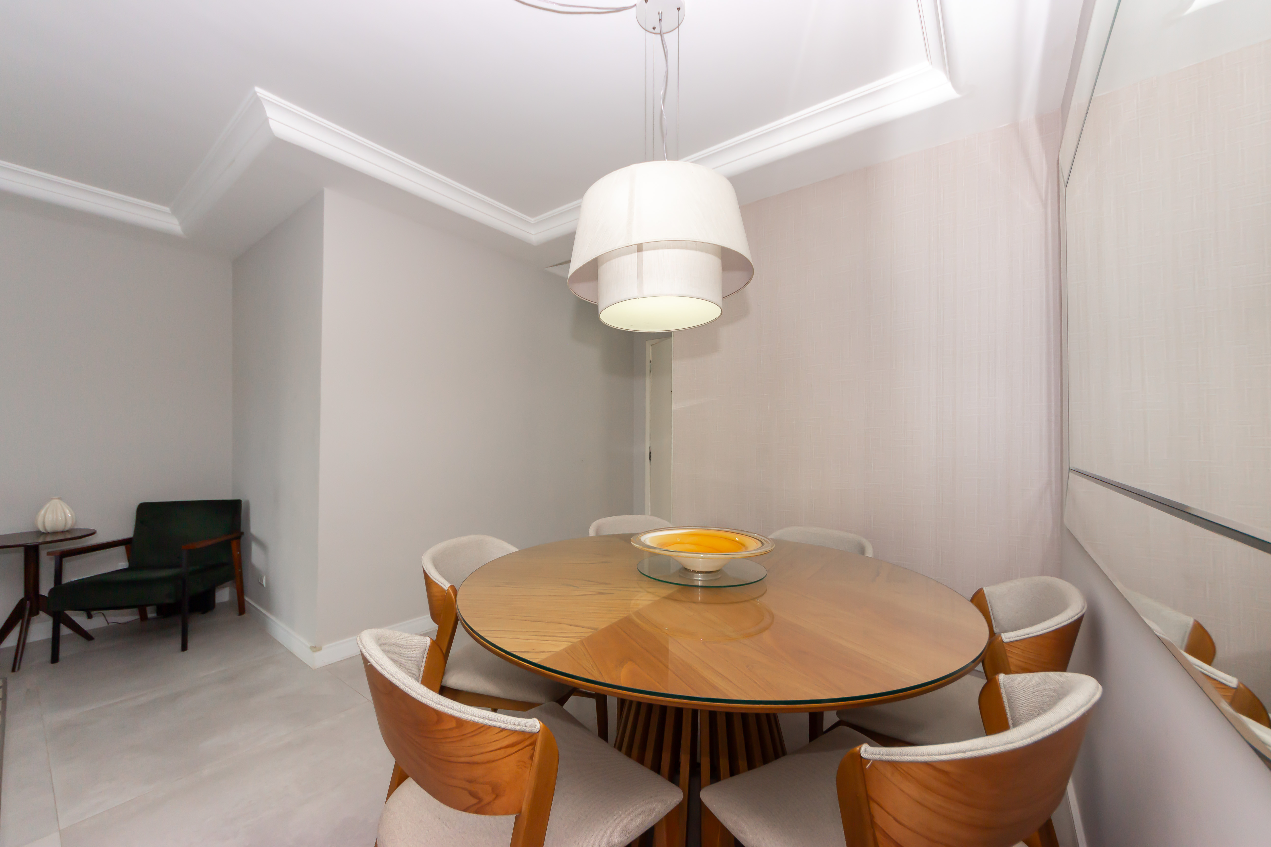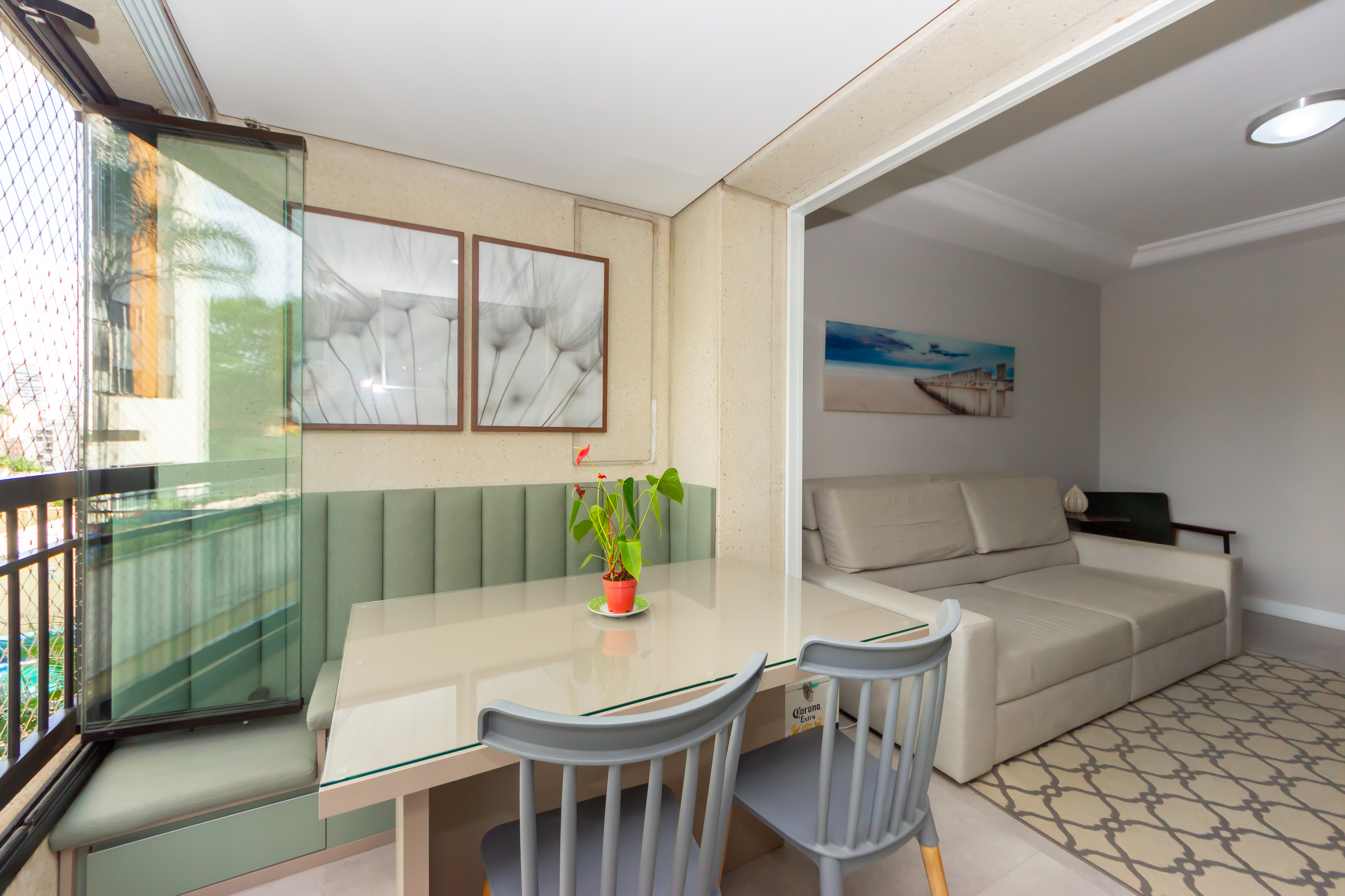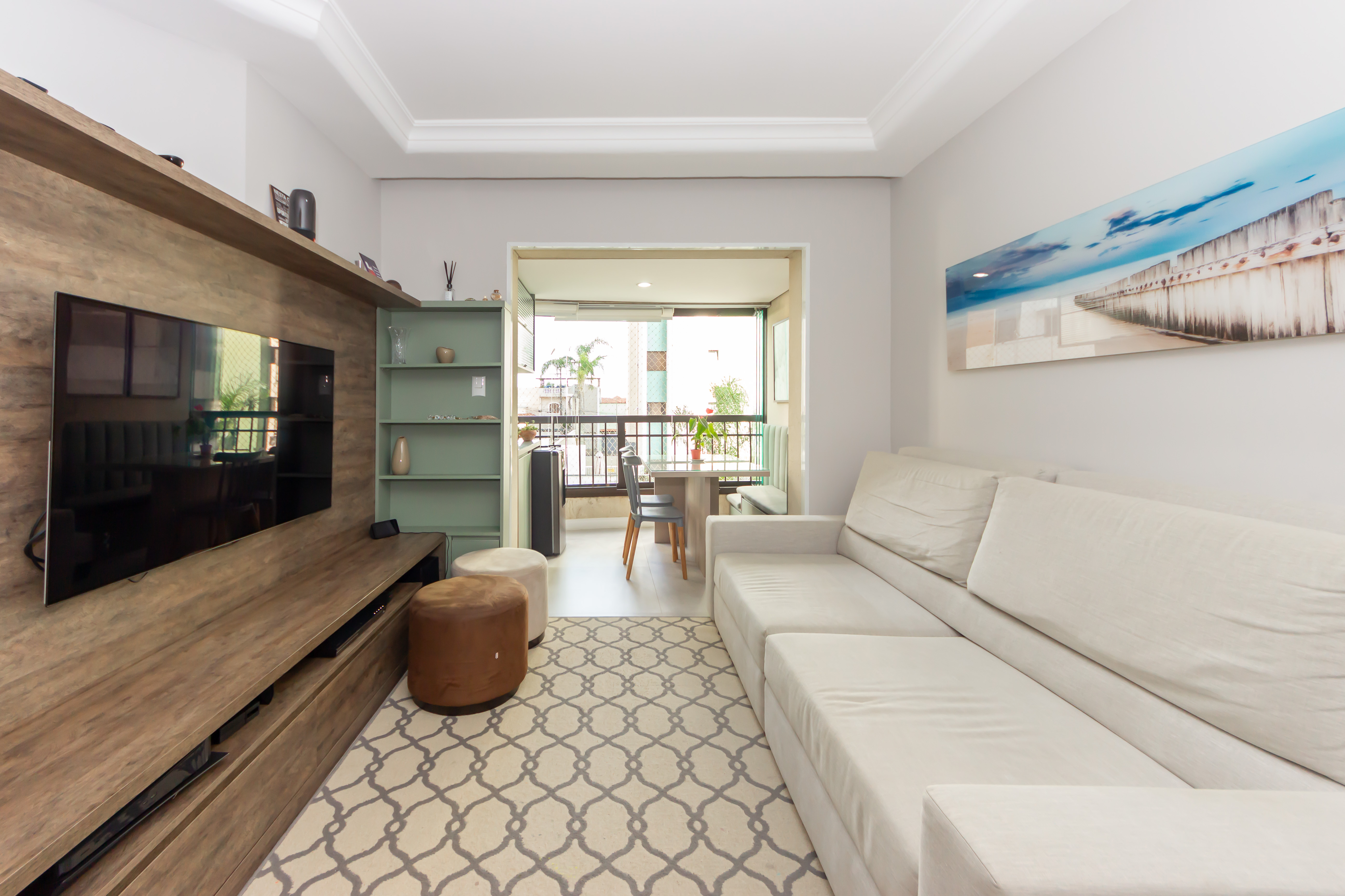 A área social é ampla e aconchegante, com living para dois ambientes, piso em porcelanato queimado nivelado com a varanda envidraçada e decorada com planejados – um espaço ideal para momentos de relaxamento ou para montar um home office cheio de charme. A iluminação natural valoriza ainda mais o ambiente.