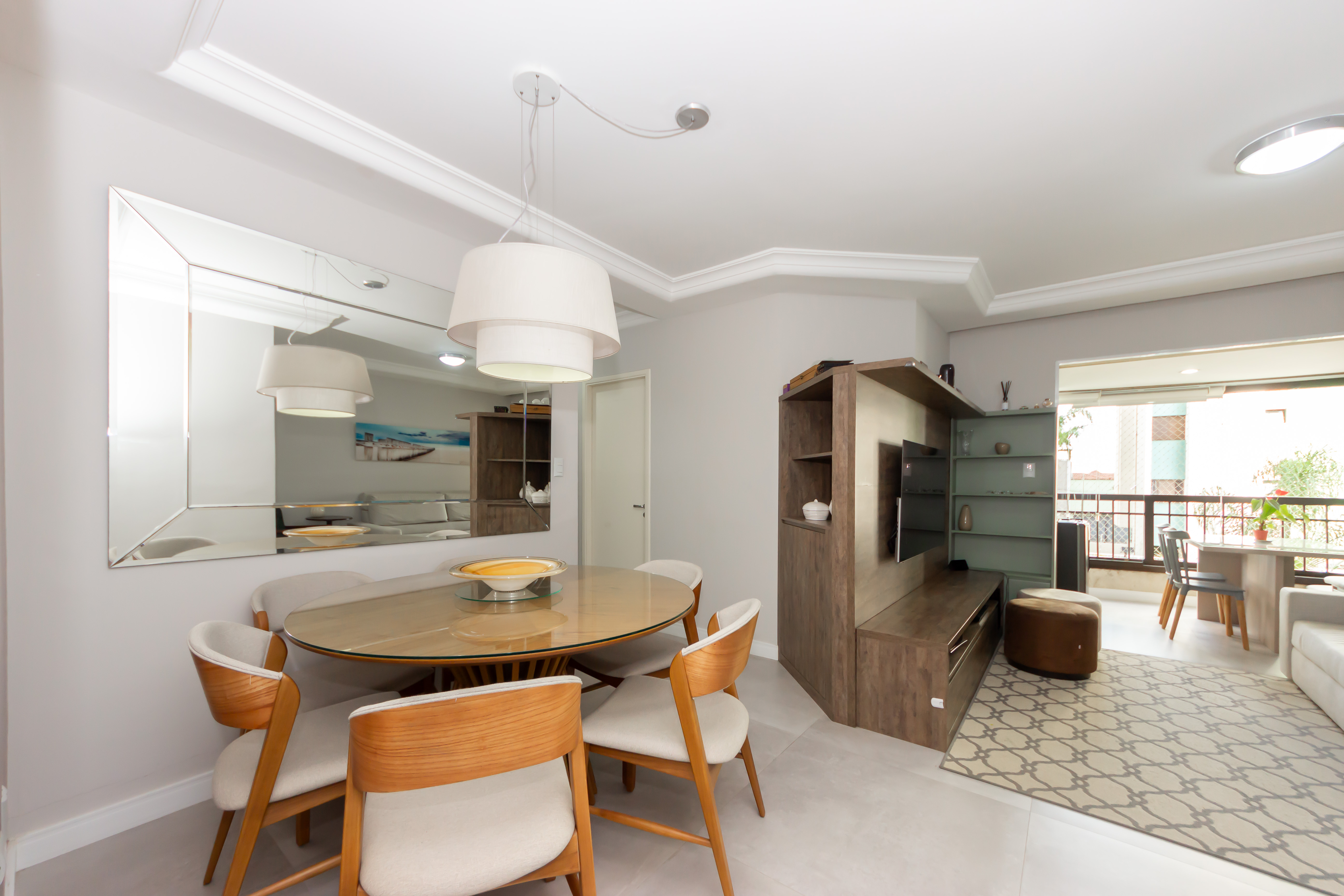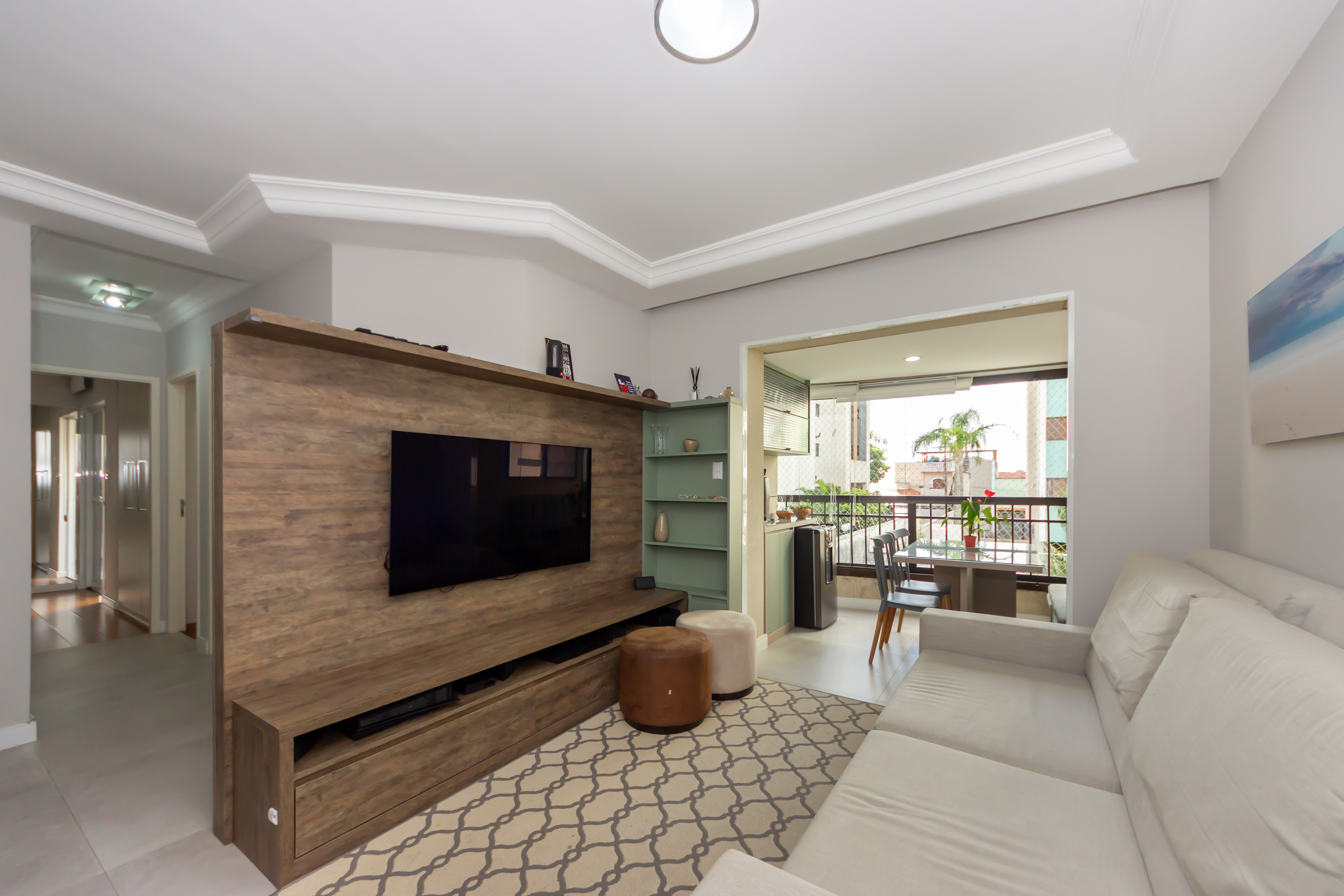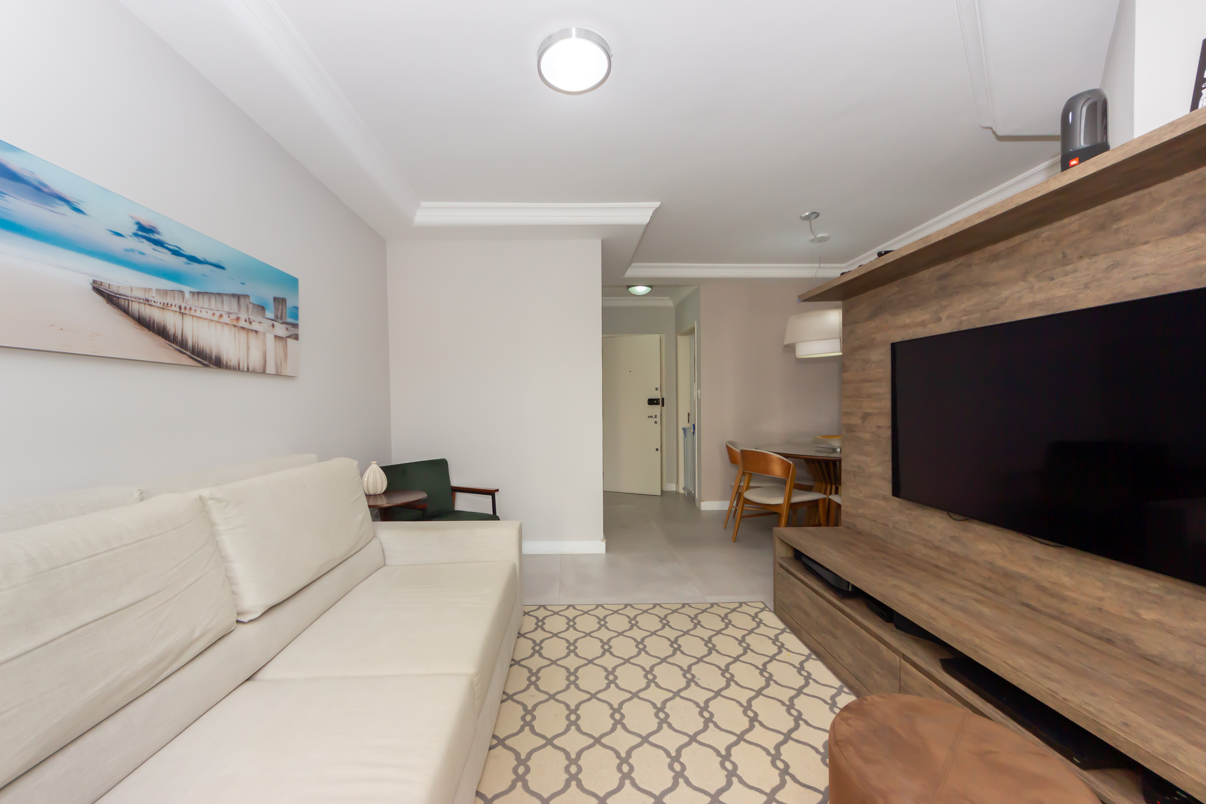 A área social é ampla e aconchegante, com living para dois ambientes, piso em porcelanato queimado nivelado com a varanda envidraçada e decorada com planejados – um espaço ideal para momentos de relaxamento ou para montar um home office cheio de charme. A iluminação natural valoriza ainda mais o ambiente.
