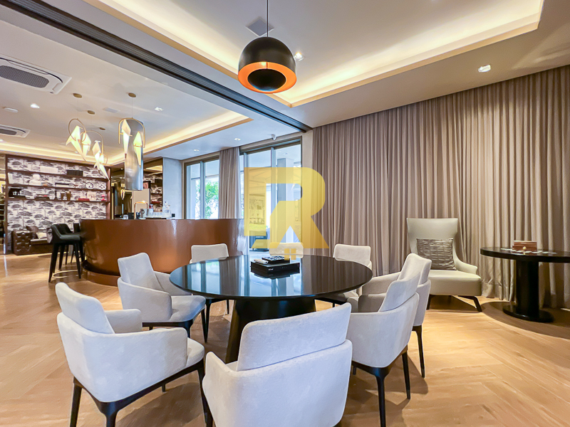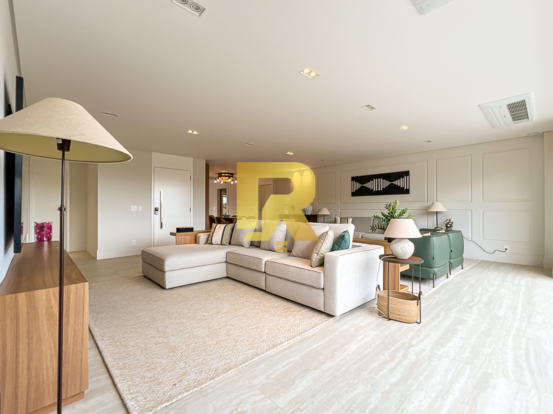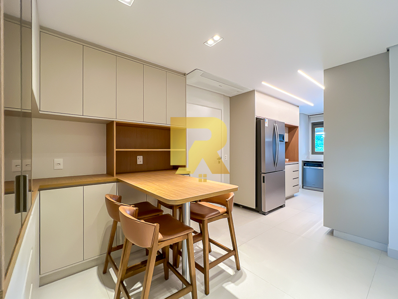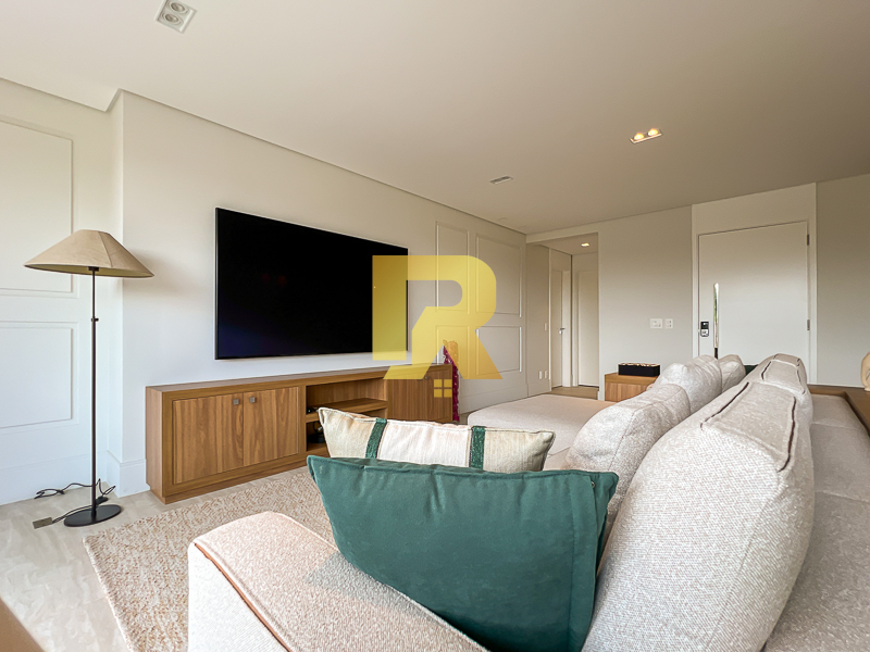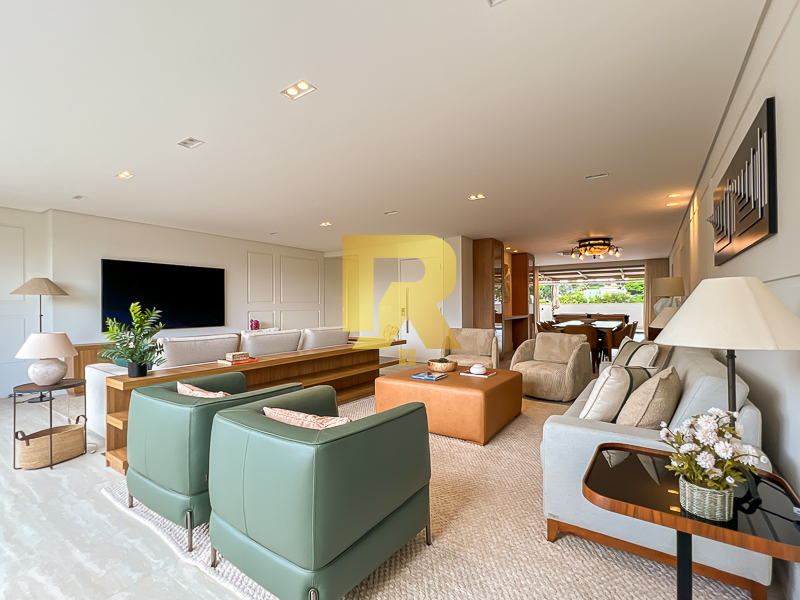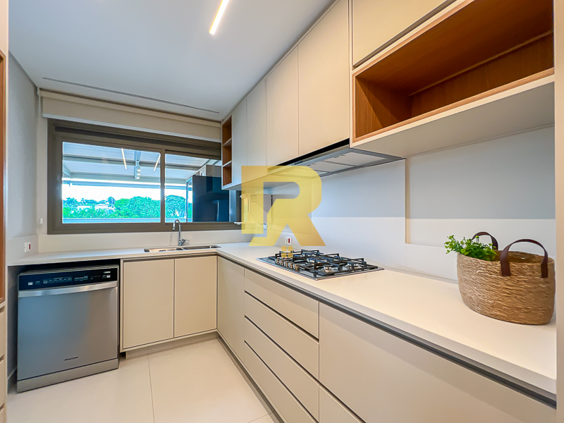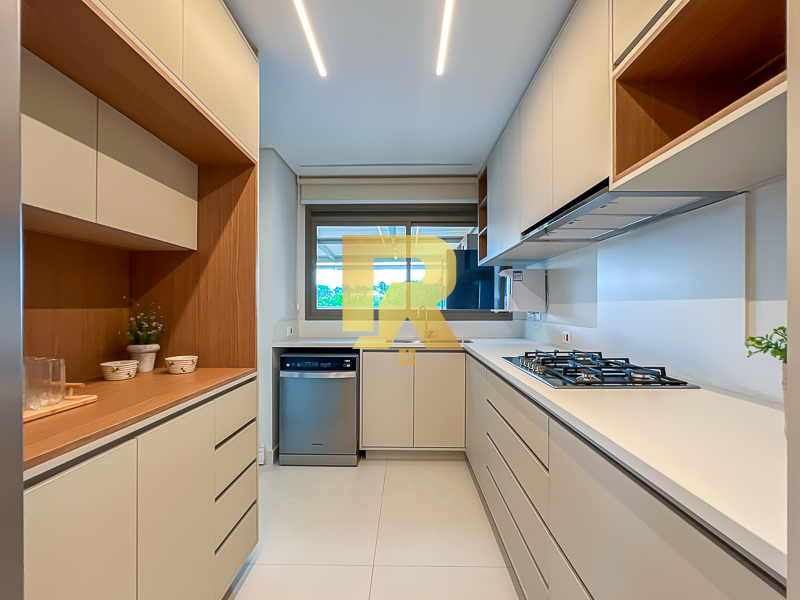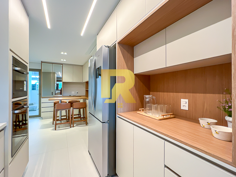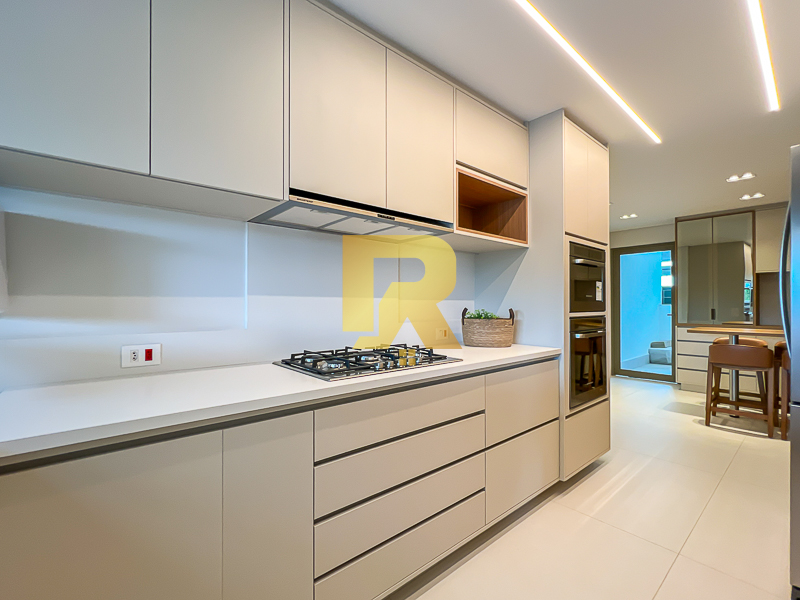 A área social se destaca pela fluidez e versatilidade, ideal para quem aprecia receber bem. As salas de estar, TV e jantar são integradas, permitindo múltiplas configurações de layout e uma decoração sofisticada. A cozinha, totalmente equipada com armários planejados, se conecta de forma harmônica aos ambientes sociais e conta ainda com área de serviço completa e área técnica, garantindo máxima funcionalidade.