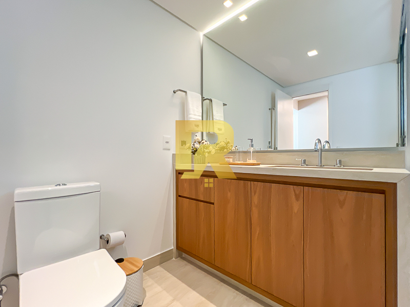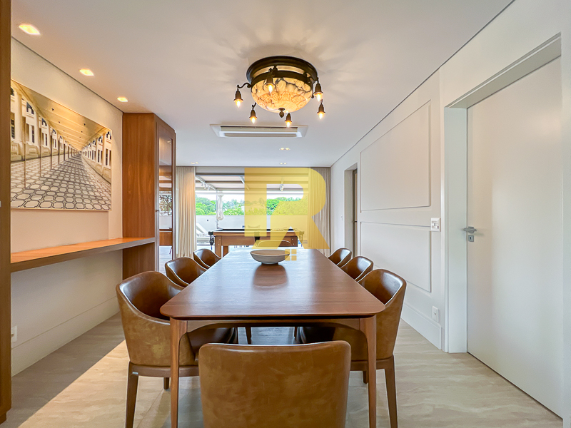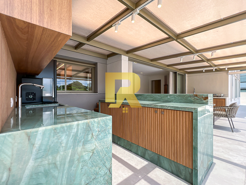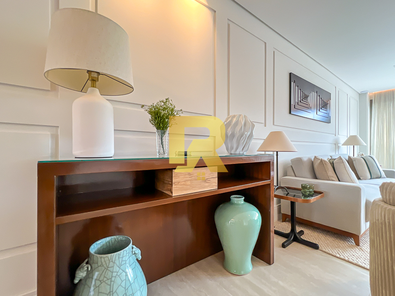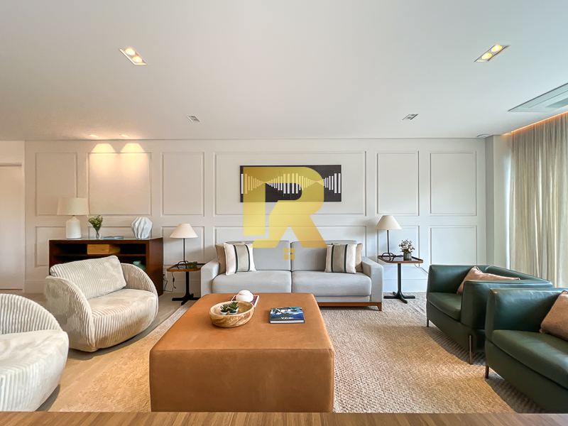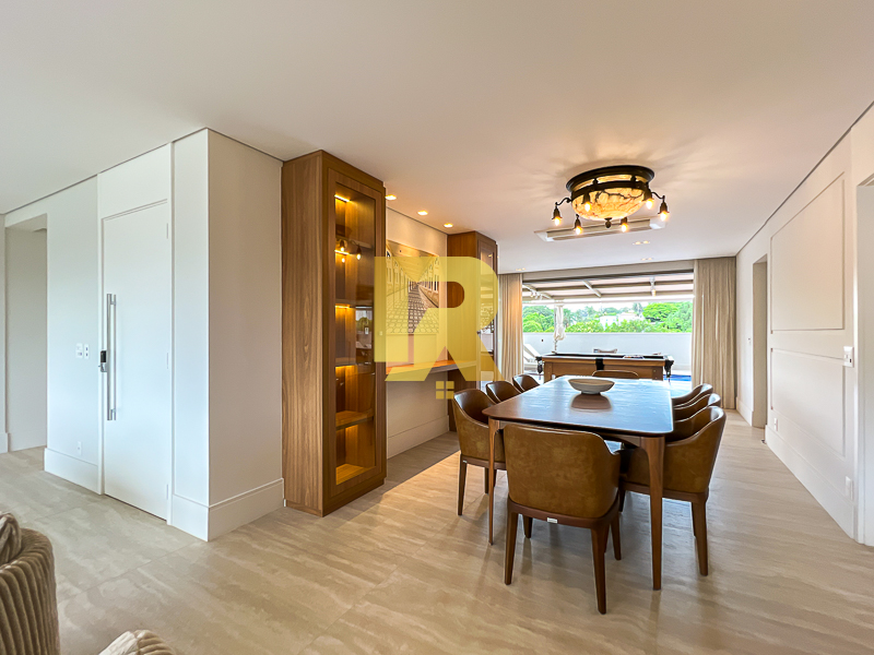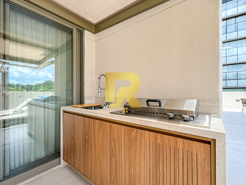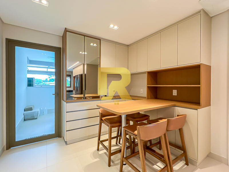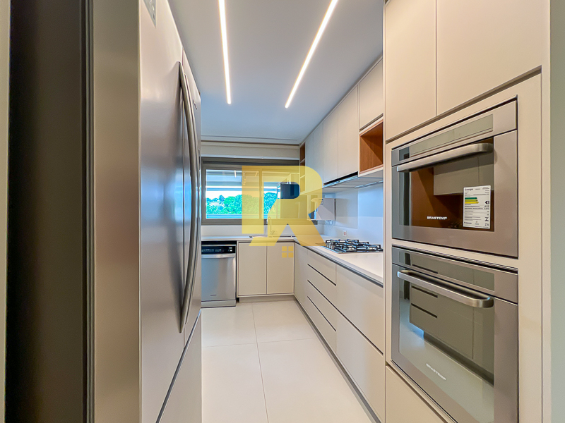 A área social se destaca pela fluidez e versatilidade, ideal para quem aprecia receber bem. As salas de estar, TV e jantar são integradas, permitindo múltiplas configurações de layout e uma decoração sofisticada. A cozinha, totalmente equipada com armários planejados, se conecta de forma harmônica aos ambientes sociais e conta ainda com área de serviço completa e área técnica, garantindo máxima funcionalidade.