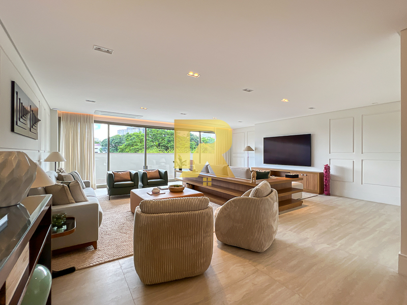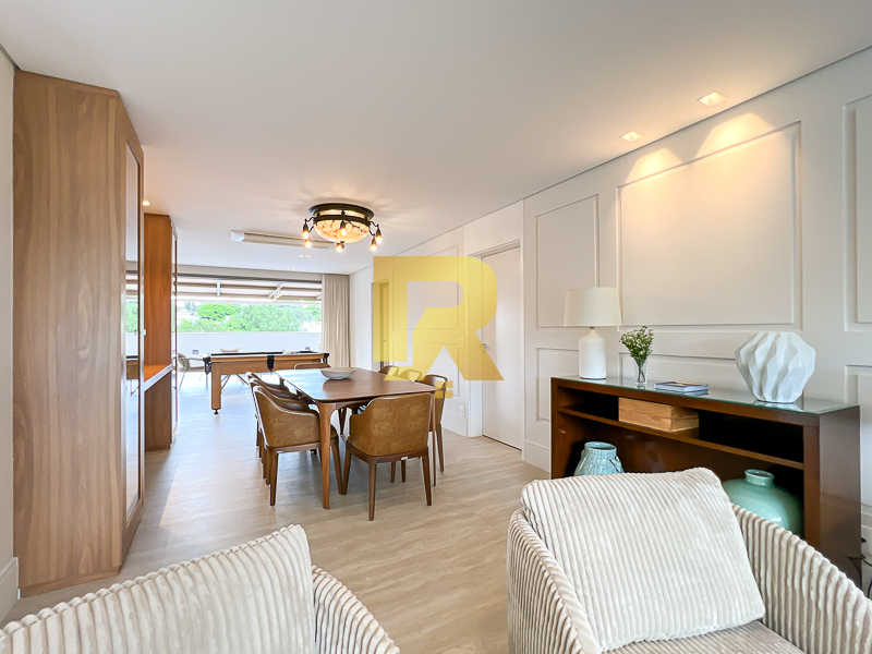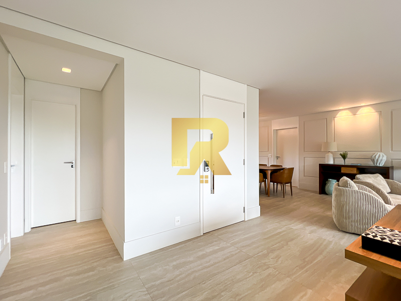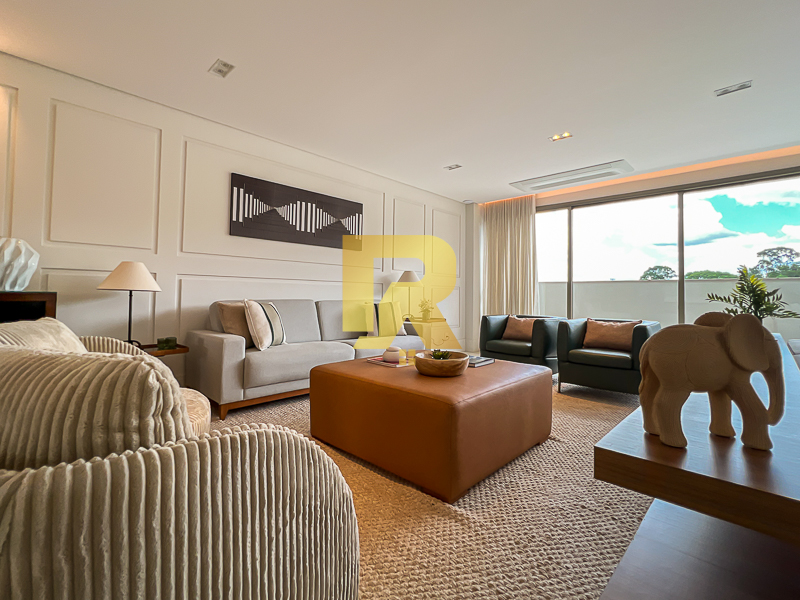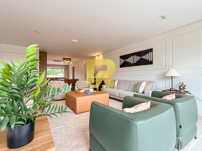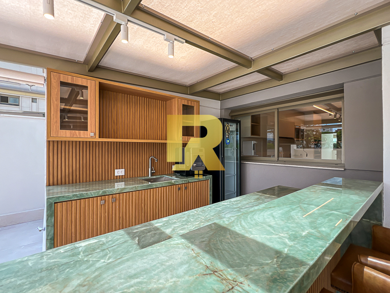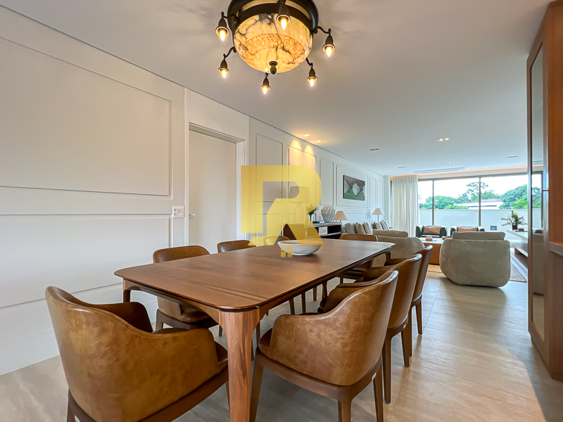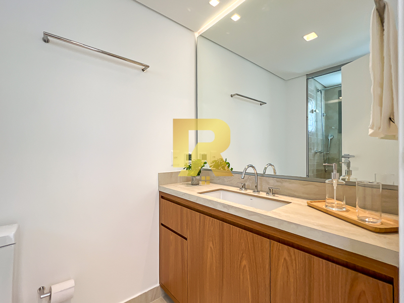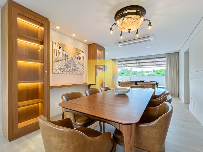 A área social se destaca pela fluidez e versatilidade, ideal para quem aprecia receber bem. As salas de estar, TV e jantar são integradas, permitindo múltiplas configurações de layout e uma decoração sofisticada. A cozinha, totalmente equipada com armários planejados, se conecta de forma harmônica aos ambientes sociais e conta ainda com área de serviço completa e área técnica, garantindo máxima funcionalidade.