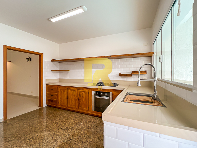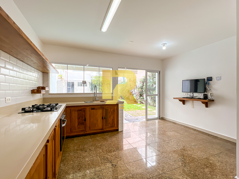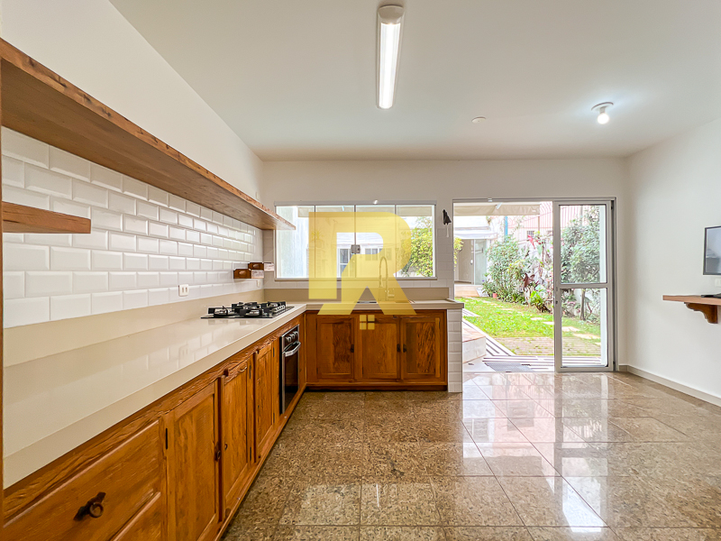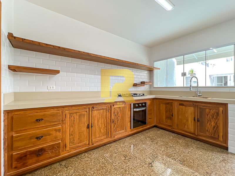A cozinha é um espetáculo à parte: piso em granito, forno e cooktop instalados, além de gabinetes em madeira de demolição que conferem personalidade e sofisticação ao espaço. A vista para a área externa com piscina torna o ambiente ainda mais convidativo. Conta também com despensa planejada, oferecendo praticidade no dia a dia.